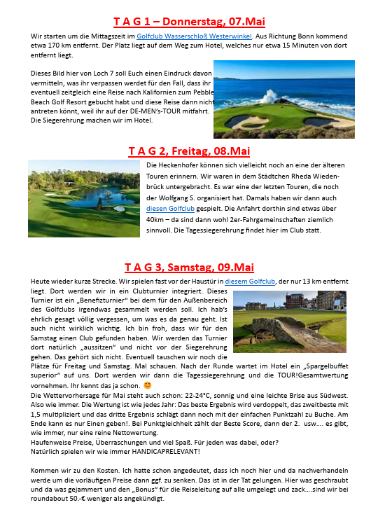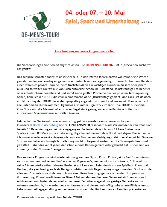 Nicht vergessen sind die Damen im Office, die uns immer voll unterstützt haben. Selbst wie am letzten Samstag unter „erschwerten“ Bedingungen mit dicker Erkältung. Danke auch an Andreas, der den TC von Anfang an unterstützt hat. GLC: Golfen bei und mit Freunden!