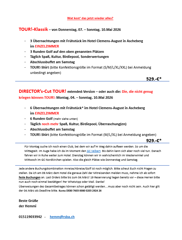 Team-Cup ist aber ein Jahresevent. 5 Spieltage, davon 4 in der handicaprelevanten Saison von Mai – September oder Oktober gefolgt vom großen Finale !
